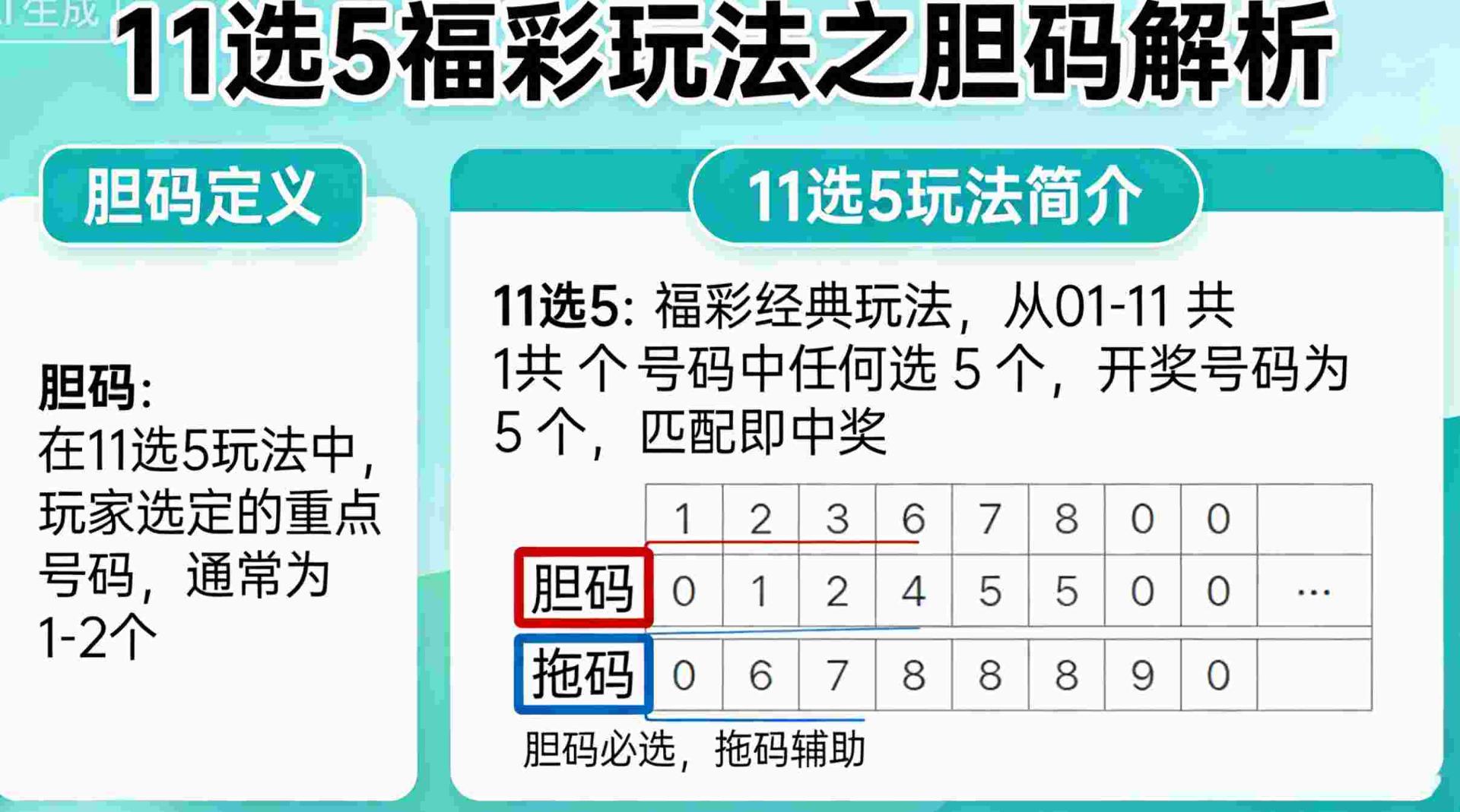 一切得从胆码的意思说起。11选5是福彩经典玩法,每天50-100期不等(如江苏11选5一天96期),从01-11共11个号码中选5个,中奖方式多样:任选五单式、组选、前三后二、胆拖等。胆码就是“胆量定码”的核心,简单说,你预选1-4个“必出”号码作为胆(固定出现在5码中),剩下1-4个从剩余号码中拖(可选组合),组成完整5码投注。比方说胆码03、07(2胆),拖码01、05、11(3拖),生成所有组合:03-07-01-05、03-07-01-11、03-07-05-11等C(3,3)=1注变身3注,成本3倍但中奖几率暴涨。为什么叫胆?因为你得有“胆”认定它必出,像战场上单枪匹马冲锋。传统单式选5纯蒙覆盖1/462,胆拖把概率拉到10%以上。我第一次懂胆码是2021年上海封城那黑春,无聊蹲小区门口彩票站,老王叼烟教我:“小子,11选5号码均匀但热冷轮换,抓前20期热胆1-3个,拖冷爆,胜率稳52%。”我试投胆01(热)、拖03-05-07-09,10倍单拖4注40元,第一期中前二赚80,那一刻肾上腺素炸裂,以为抓到金矿。